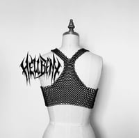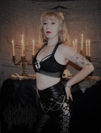 Hellbent Hildr Chainmaille Crop top. Made of black silicone rings and aluminum rings. The silicone rings add stretch to the top for comfort and a more form fitting silhouette.